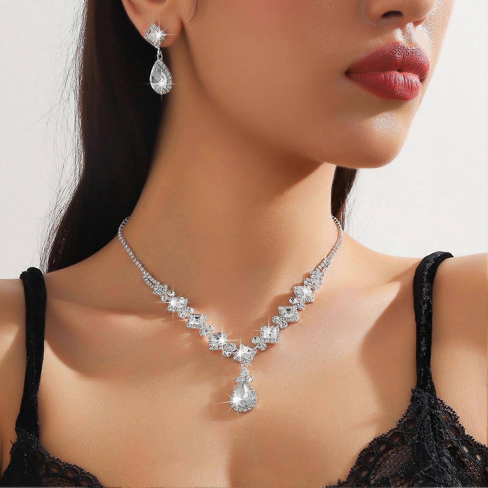 Features : Elegant Design: This women's 2-piece necklace and earrings set features sparkling rhinestones that add a touch of elegance, making it perfect for special occasions like weddings and anniversaries. Hypo-allergenic Materials: Crafted from hypo-allergenic materials, this dazzling jewelry set ensures comfort for all skin types, allowing you to shine without irritation during long wear. Versatile Style: Ideal for a variety of events, this jewelry set complements banquet gowns, birthday dresses, and skirts, making it a versatile addition to your accessory collection. Perfect Gift Choice: Surprise your loved ones with this stunning jewelry set, a thoughtful gift for mother's day, anniversaries, or as a bridesmaid present for a memorable wedding celebration. Complete Bridal Look: Enhance your bridal ensemble with this full rhinestones necklace and earrings set, designed to make you sparkle on your special day, whether at a wedding or masquerade. Specifications : Materials: Alloy Necklace Length: 27.5+15cm Fit for: for Banquet Gown Birthday Dresses Skirts Notes: 1. Actual color may be slightly different from the image due to light effect. 2. Please allow 1-3cm deviation due to manual measurement. Include: 1 * Necklace 1 Pair * Earrings