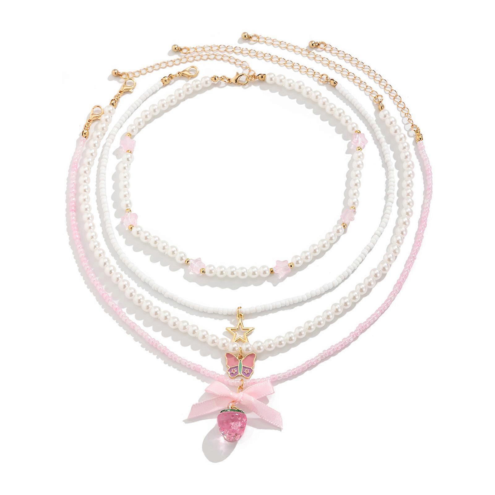 Features: Elegant Multi-Layer Design: This stunning multi layer pendant necklace features a sweet strawberry pendant combined with lustrous pearls, creating a chic and fashionable accessory for any occasion. Versatile for Any Occasion: Perfect for mother's day, anniversaries, or holiday parties, this pendant pearl necklace for women adds a touch of elegance to your outfit, making it an ideal gift for loved ones. Unique Strawberry & Pearl Combination: The strawberry pendant pearl necklace boasts a delightful strawberry design paired with pink pearls, making it a charming statement piece that stands out beautifully. Dazzling Butterfly & Star Accents: Adorned with a hollowed golden star and a romantic butterfly pendant, this necklace adds a whimsical touch, perfect for evening parties or special celebrations. Thoughtful Gift Choice: Surprise your wife or mother with this exquisite collarbone stacking necklace, a perfect birthday gift that showcases love and appreciation on any special occasion. Specifications: Material: Imitation Pearl, Acrylic, Webbing, Alloy, Oil Drip, Beads Perimeter: 36+7cm, 37+7cm Pendant Width: 1.5cm Note: Due to the screen lighting effect, the actual color of the product may be slightly different. Due to manual measurement, please allow size error. Include: 1 Set Necklaces (4pcs)