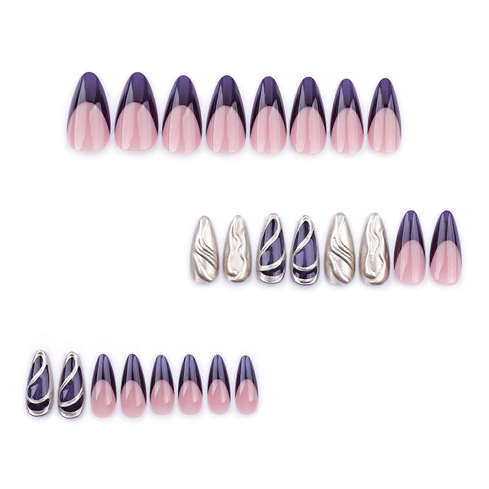 Features: French Glossy Almond Shape: Our full cover violet almond press-on nails feature a stunning french glossy finish, providing a chic and sophisticated look for any occasion. 3D Silver Glossy Design: Elevate your nail game with our 3d silver glossy almond artificial nails, designed to add a touch of glamour and sparkle to your everyday style or special events. Easy to Wear Comfort: Enjoy the convenience of easy-to-wear, never-splitting comfort fake nails that are lightweight and designed for a secure fit, ensuring all-day wear without discomfort. Chip-Proof & Smudge-Proof: Our fake nails are chip-proof and smudge-proof, allowing you to confidently flaunt your beautiful nails without worrying about wear and tear during your daily activities. Perfect for Any Occasion: Whether you're shopping, traveling, or dating, our false nails are ideal for holiday parties or daily matching, making them a versatile choice for women's nail art decoration. Specifications: Material: Resin Quantity: 24PCS Notice: 1.Actual color may be slightly different from the image due to light effect. 2.Please allow 1-3cm deviation due to manual measurement. Include: 1 Set * False nails (24pcs included) 24 PCS * Jelly glue 1 * Nail rub strip