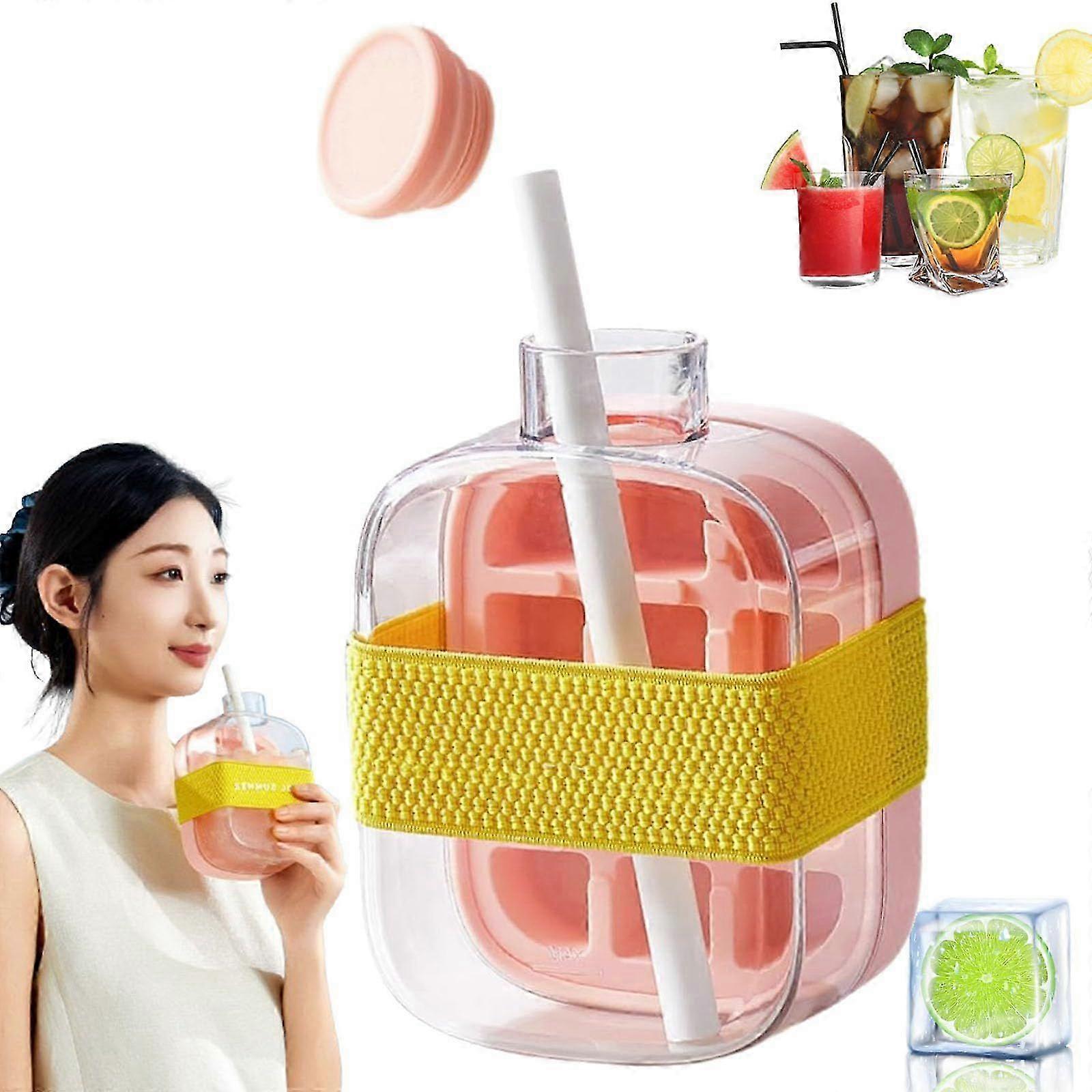 2-in-1 Ice Cube Tray Water Bottle with Straw, Touch-Free Easy-Release Freezer Bottle, Gym Ice Mold Water Bottle for Juice Coffee
