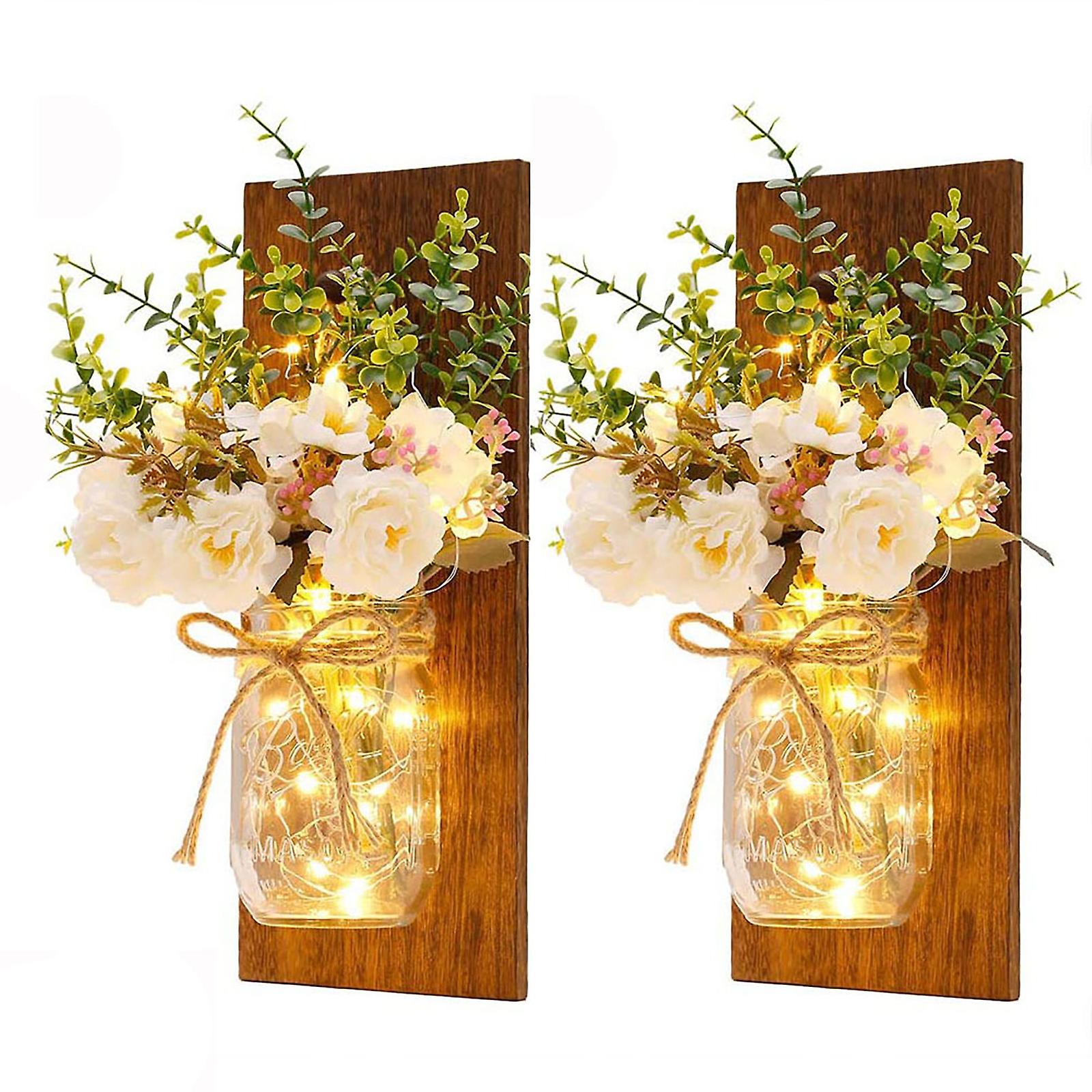 2 Pcs Vintage Plank Led Mason Jar Wall Lamp, Indoor And Outdoor Courtyard Vase Hanging Lamp For Home Wall Decoration