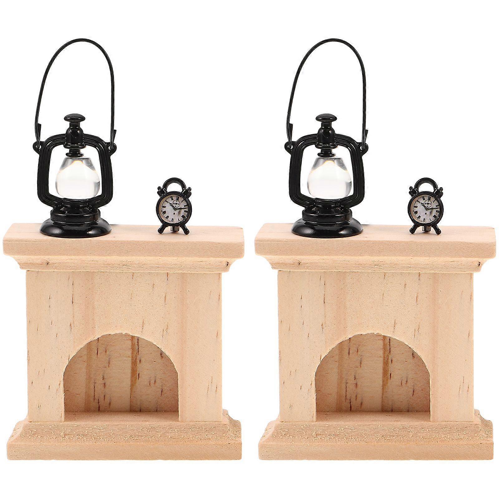 2Set Miniature Wooden Fireplace: Vintage Mini Kerosene Lamp and Clock on Fireplace Decoration - Dollhouse Christmas Accessories for Micro World Preten