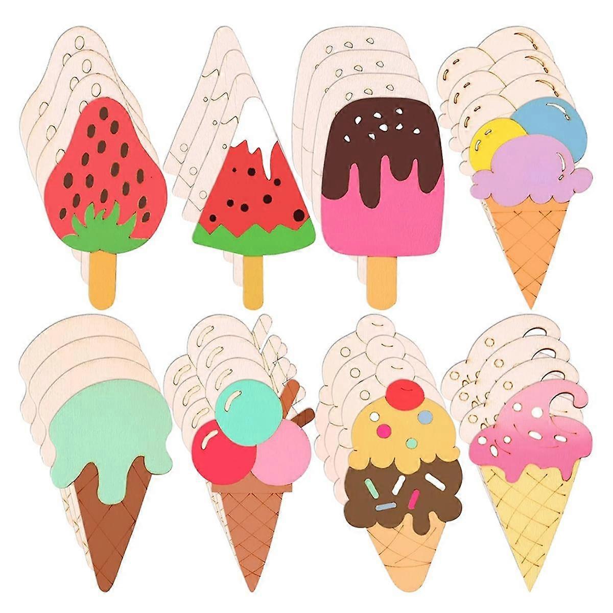 32 Pcs Unfinished Ice Cream Wooden Cutouts,8 Styles Ice Cream Wood Slices Unfinished Wood for DIY Crafts Home Decoration