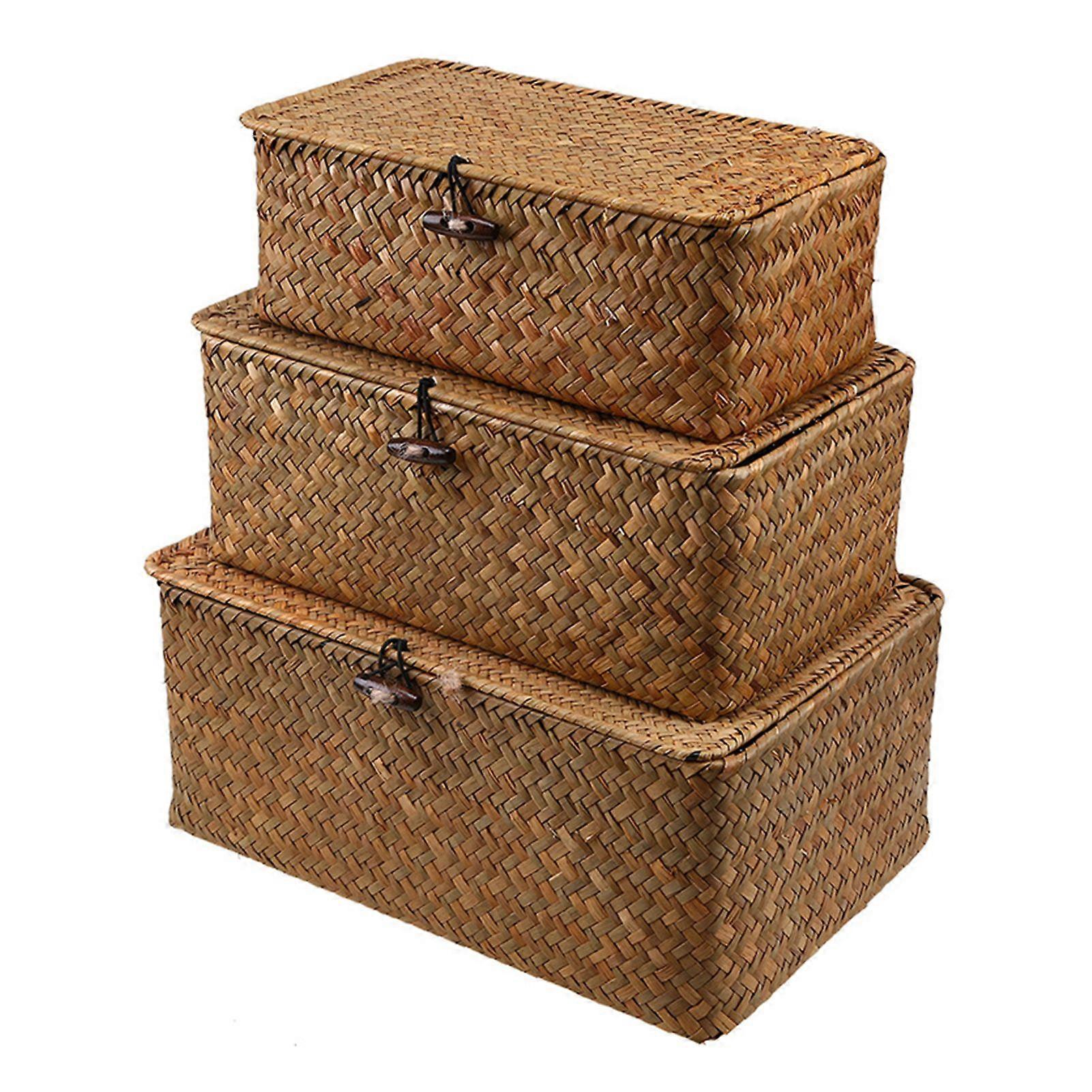 3Pcs Woven Rattan Storage Baskets with Cover Large Capacity Natural Style Wicker Storage Baskets Stackable Sundries Storage Boxes
