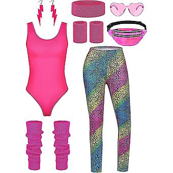 8-osainen naisten 80-luvun treeniasu, halloween- ja 90-luvun asusteet, trikootit, vyölaukku, lasit, pääpanta, säärystimet