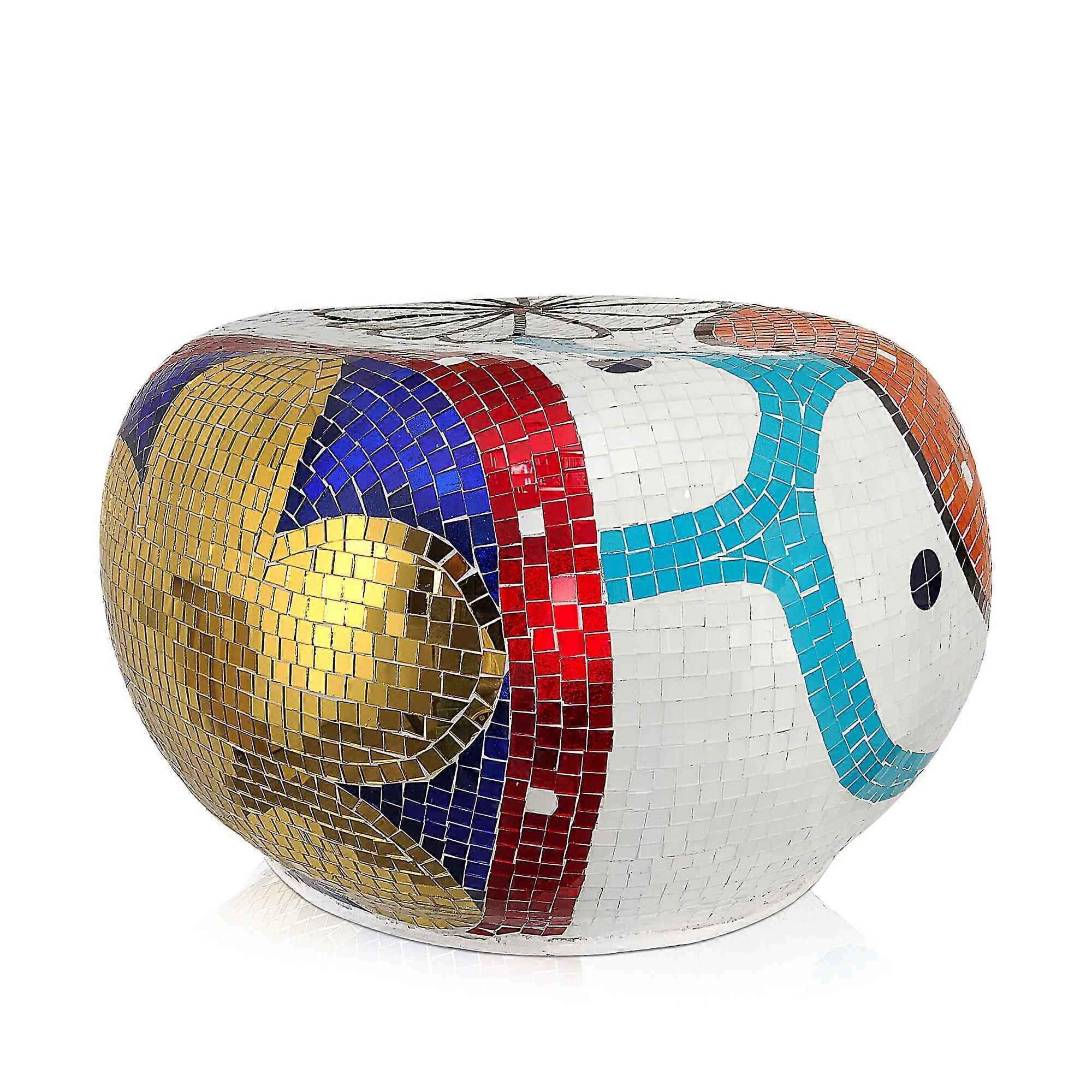 Mosaic decorations glass coffee table or stool. Handmade process for a result that is only obtained thanks to the work of patient and skilled hands. The fragmented glass bestows a particularly refined look to this work of art, creating games of light and reflections that enhance its shapes and volumes: this is a high quality product designed to acquire more value over time. Every artwork comes with a certificate of craftsmanship DIMENSIONS: 36 x 64 x 56 cm