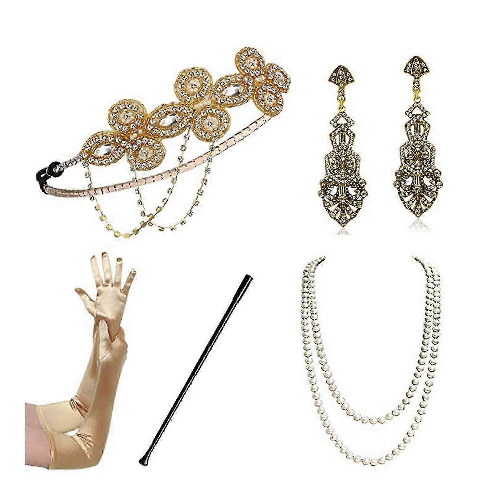 Flapper Accessories For Womens 1920s Gatsby Costume Accessory Roaring 20s Flapper Headband Earrings Gloves Necklace Set