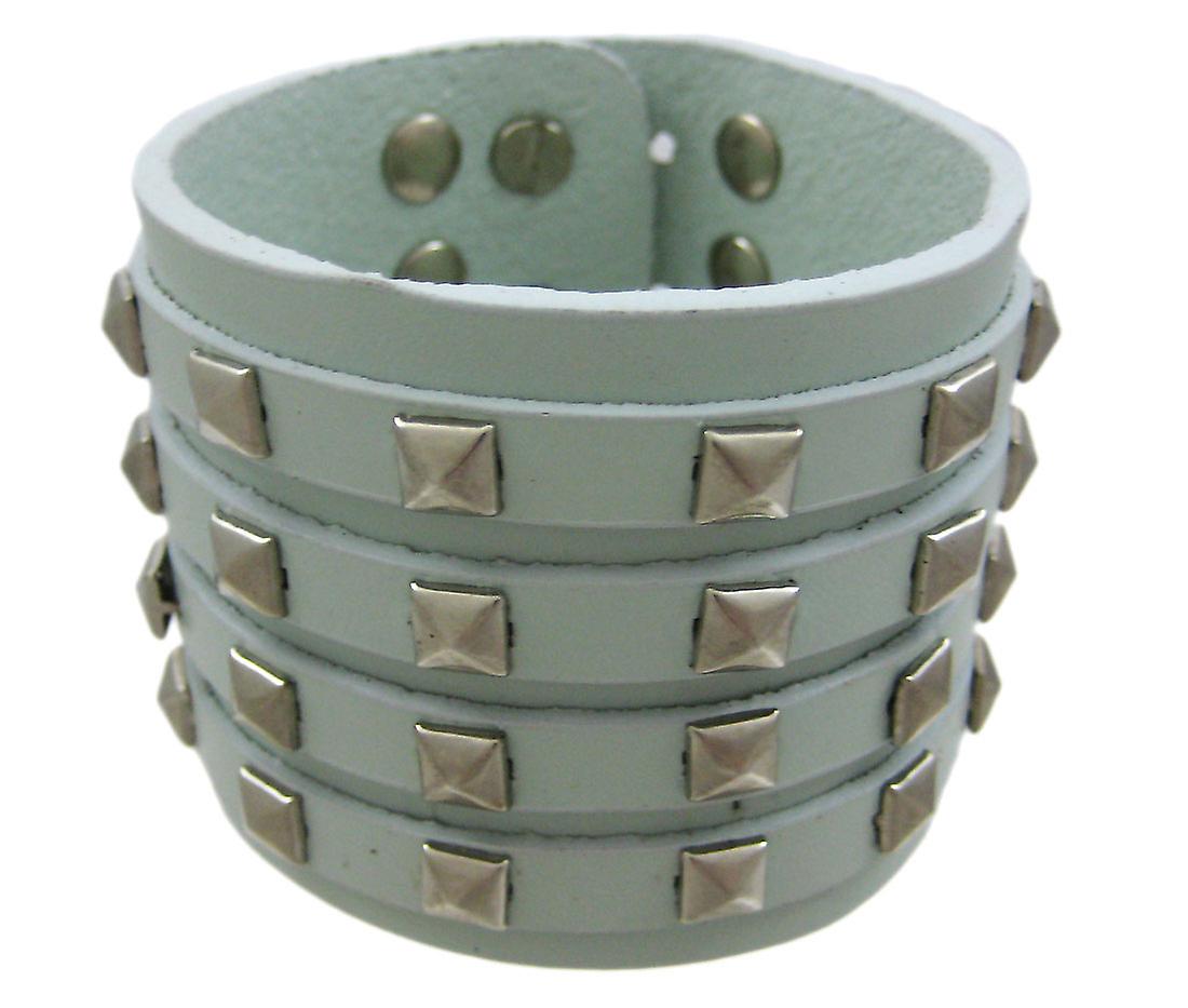This gauntlet-style gray leather wristband features 4 thin leather straps, all accented with chrome-plated pyramid-shaped studs. The wristband is 2 inches wide, with a double tab closure, and fits 7 1/2 to 8-inch wrists. This wristband makes a great gift for friends and family.