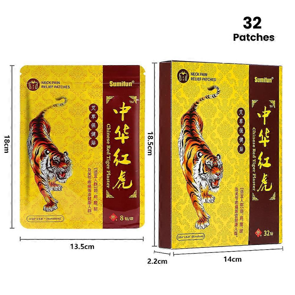 High-quality Red Tiger cervical care patches with green medicated coating -- 32 patches/box. Red Tiger patches box contains 32 pieces for neck, shoulder, waist, leg, and joint care. K40054