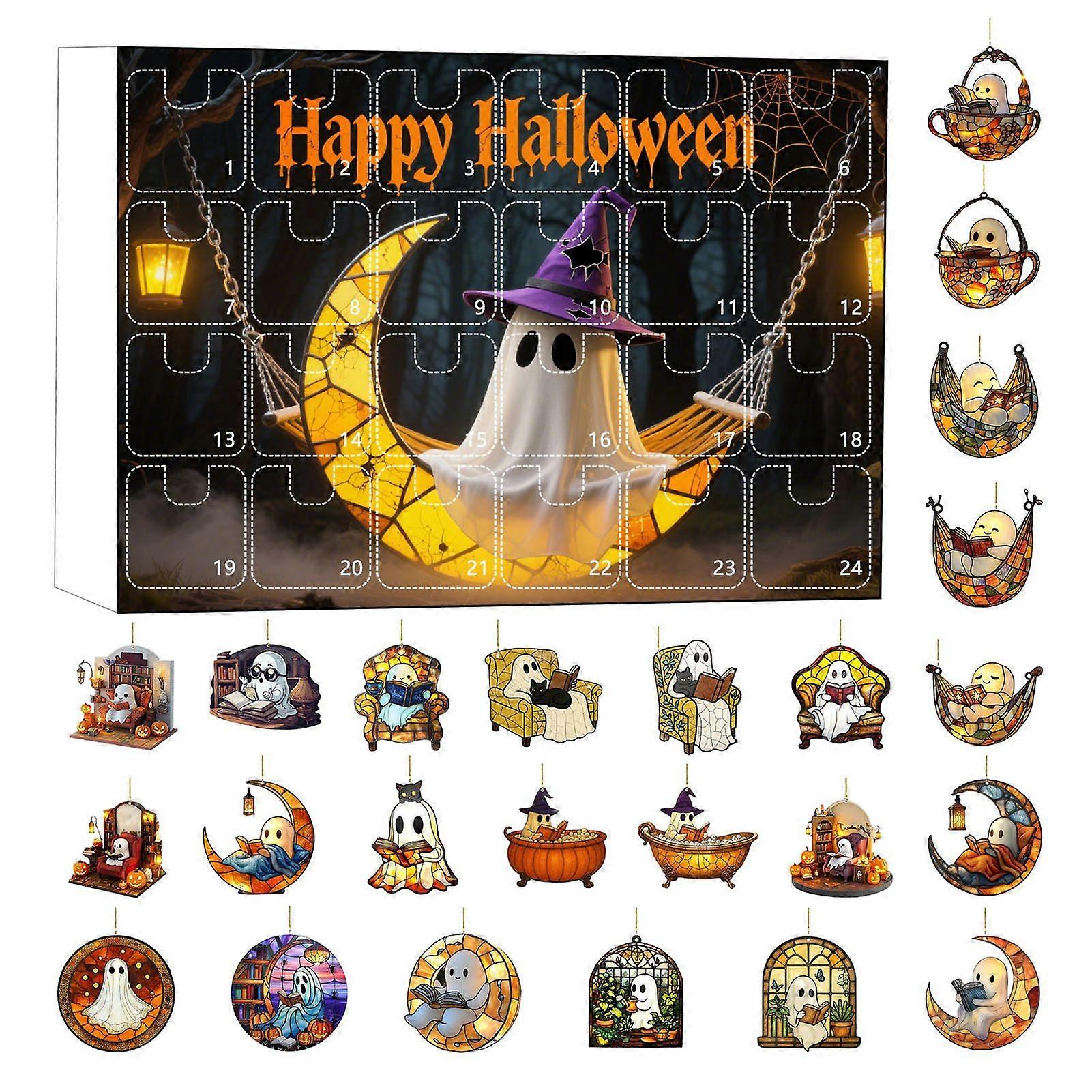 Jikaixiang 2025 Halloween 2D Ghost Reading Ornament Countdown Set 24 Days Advent Calendar Stained Glass Window Hanging Suncatchers for Home Decor