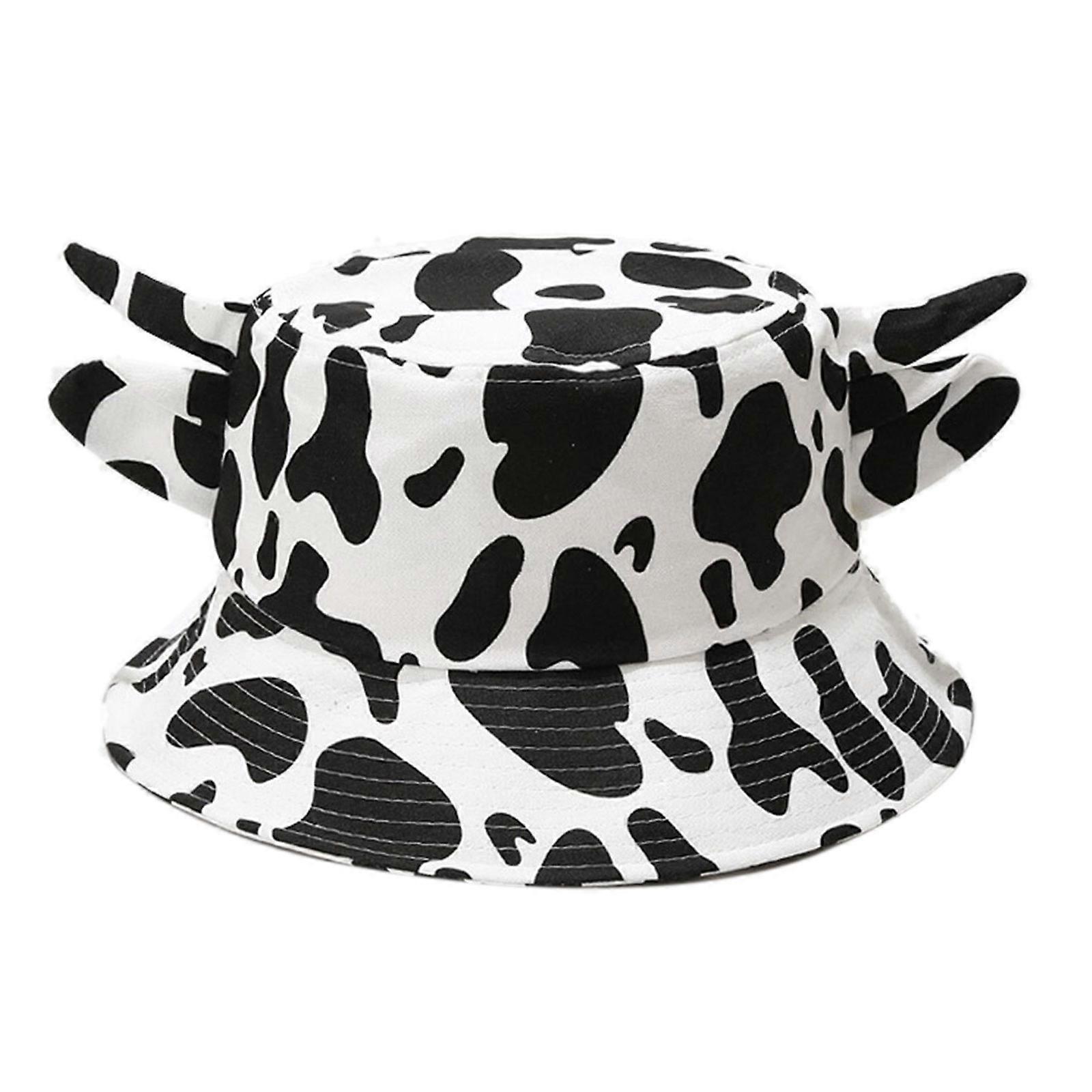 Fisherman Hat with Horns & Ears Cute Cow Print Bucket Hat for Outdoor Travel