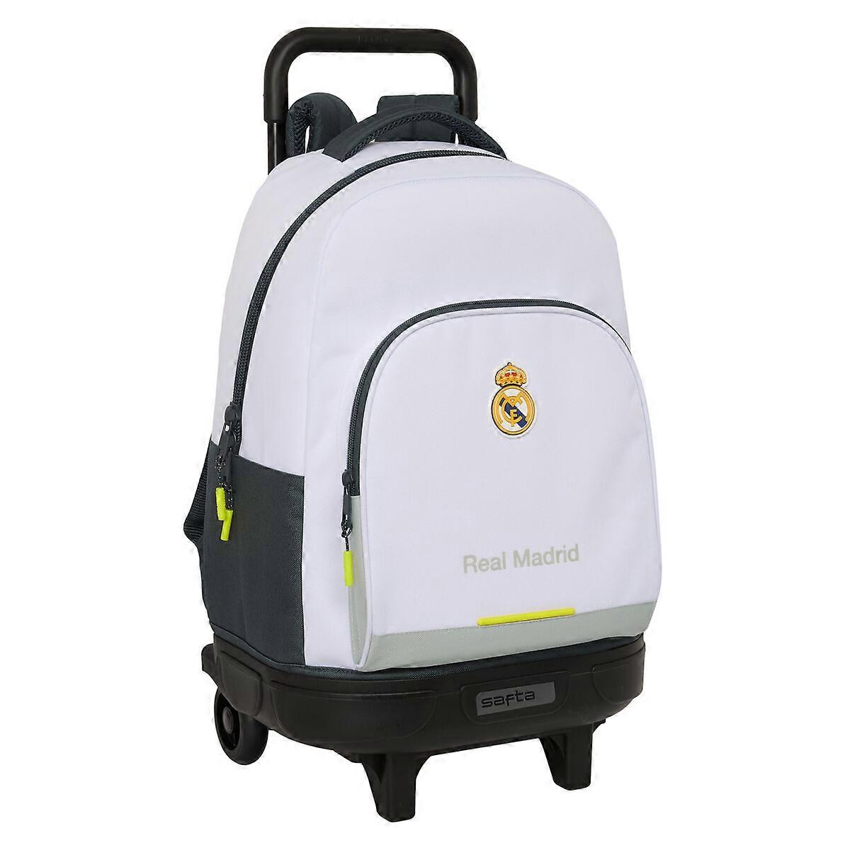 we present the School Bag Real Madrid C.F. Type: School BagMaterial: Polyester 600DColour: WhiteDesign: SportingType of fastening: ZipCharacteristics: RemovableErgonomic paddingPersonal identification cardReinforcedApprox. dimensions: 33 x 45 x 22 cmCompartments: Main compartmentFront pocketCertificate: REACH