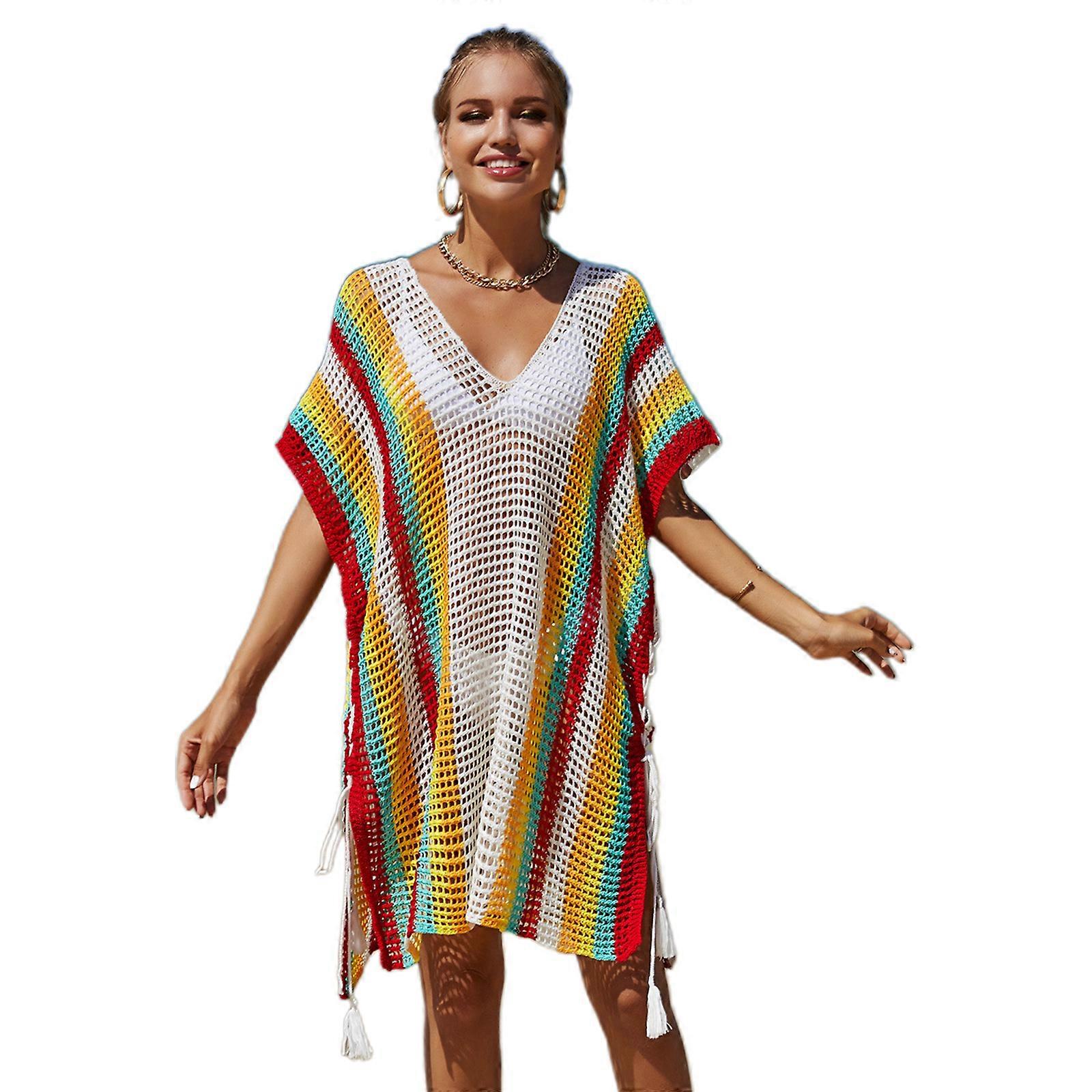 Woman Sexy Deep V-Neck Short Sleeve Swimwear Mesh-Translucent-Crochet Long Dress Knitted Beach-Bikini Swimsuit Cover Ups White