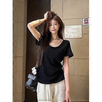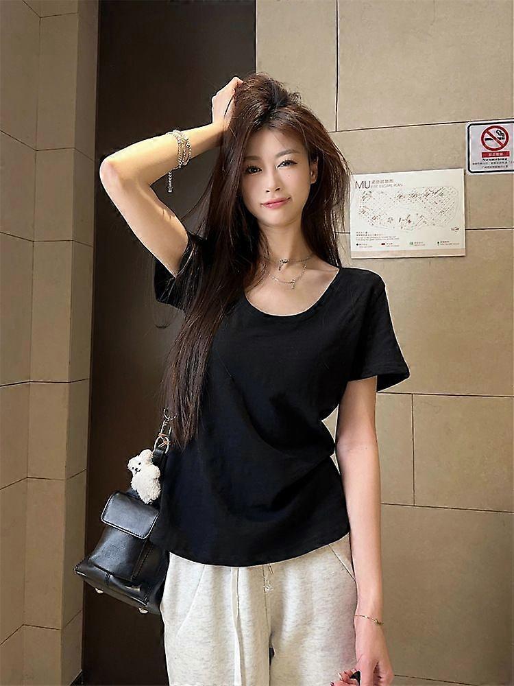 Real Shot Pure Color All-Matching Short-Sleeved T-Shirt For Women Spring And Summer Leisure Shoulder Inner V-Neck Korean Style Top For Women