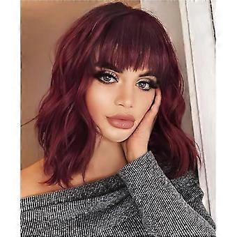 Viininpunainen lyhyt polkkatukkainen synteettinen peruukki otsatukalla - luonnollinen ulkonäkö, lämmönkestävä kuitu, cosplay-, juhla-, arki- ja festivaaleille