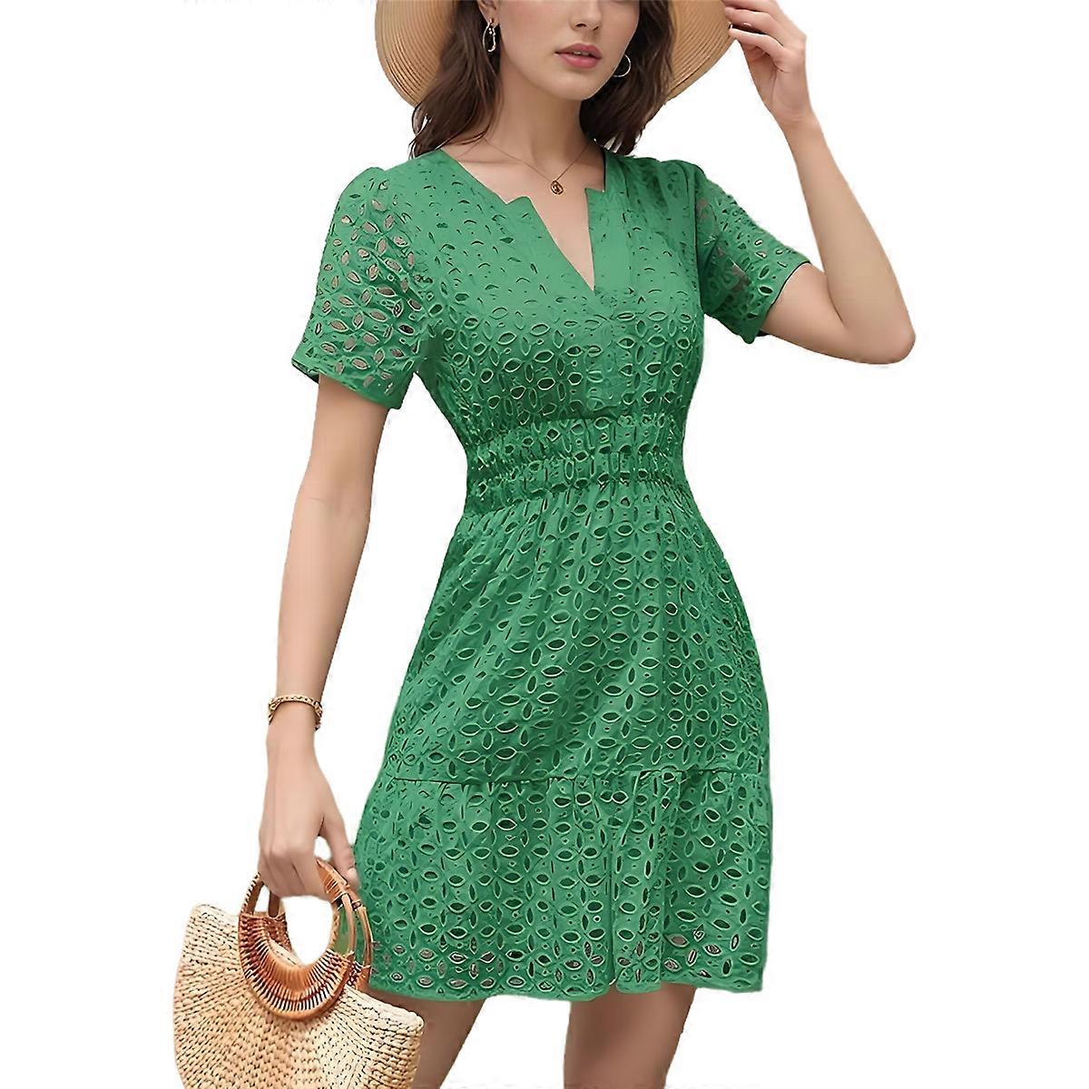 V Neck Eyelet High Waist A-Line Skirt Green M