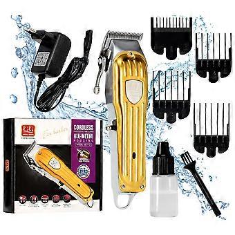 Profesjonalna maszynka do strzyżenia włosów. Solidna konstrukcja i wytrzymała bateria. Idealny zestaw startowy dla poczatkującego fryzjera. Od dziś skrócisz włosy lub brodę bez wychodzenia z domu -  w szybki i bardzo łatwy sposób Maszynka została wyposażona w specjalną dźwignię za pomocą której precyzyjnie ustawisz długość strzyżenia włosów. Maszynka do włosów posiada nierdzewne ostrza, pojemną baterię pozwalającą na około 250 minut pracy oraz otwór do odwieszenia na hak. Na tej aukcji dostępny kolor złoty. Maszynka posiada atrakcyjny design. Cechy produktu: Solida konstrukcja Bateria 2000 mAh Otwór do odwieszenia na hak Prędkość silnika 6500 RPM Regulowany zakres ostrzy Maszynka przypadnie do gustu zarówno mężczyznom, jak i kobietom. Akcesoria: 4 wymienne nasadki Olejek oraz pędzelek do czyszczenia ostrzy Ładowarka sieciowa Nasze maszynki cechują się najlepszą jakością wykonania i materiałów w stosunkowo niskiej cenie. Dodatkowo eleganckie pudełko idealne na prezent.