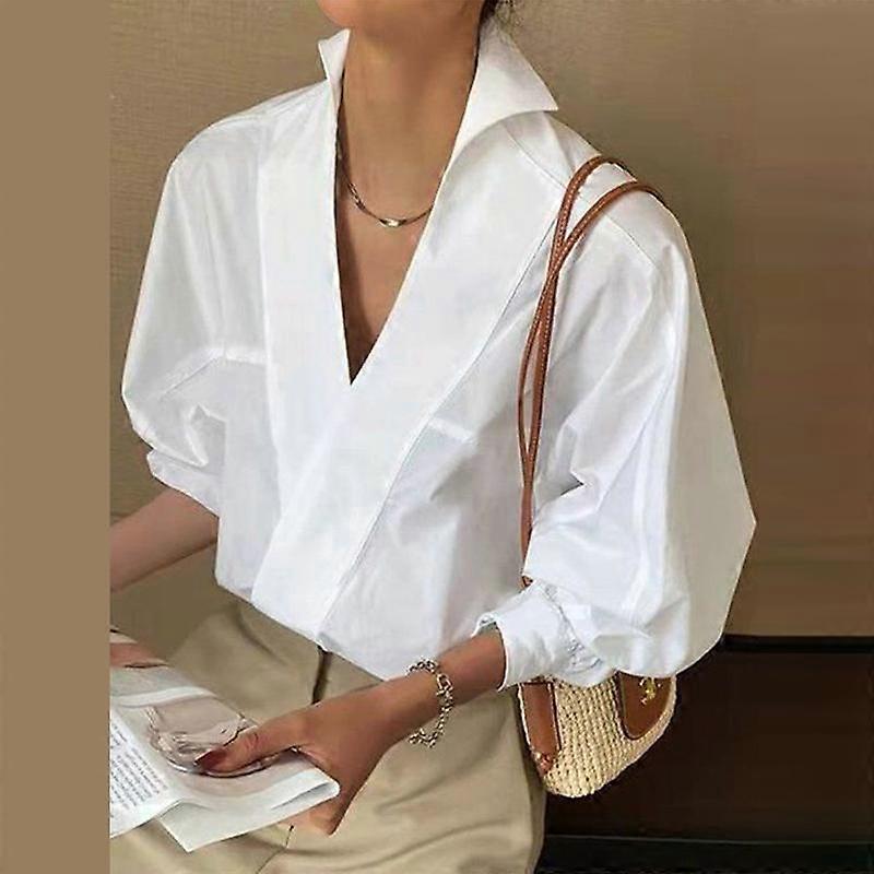ZANZEA Women's V-Neck Standing Collar Split Bubble Long Sleeve Solid Colour Loose Shirt